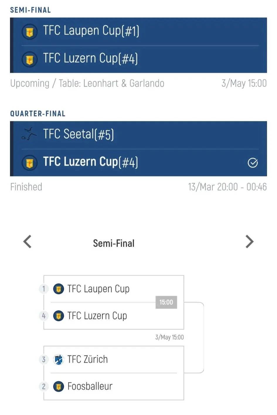 Seit diesem Jahr gibt es einen neuen Anlass, das die TFCL Herzen höher schlagen lässt. In der Cup Liga spielen die Vereine, wie an der Swiss Tablesoccer League, als Team gegeneinander. Das erste Spiel gegen und im TFC Seetal haben wir erfolgreich gemeistert. Bald steht bereits das Halbfinale an - Wir sind gespannt!